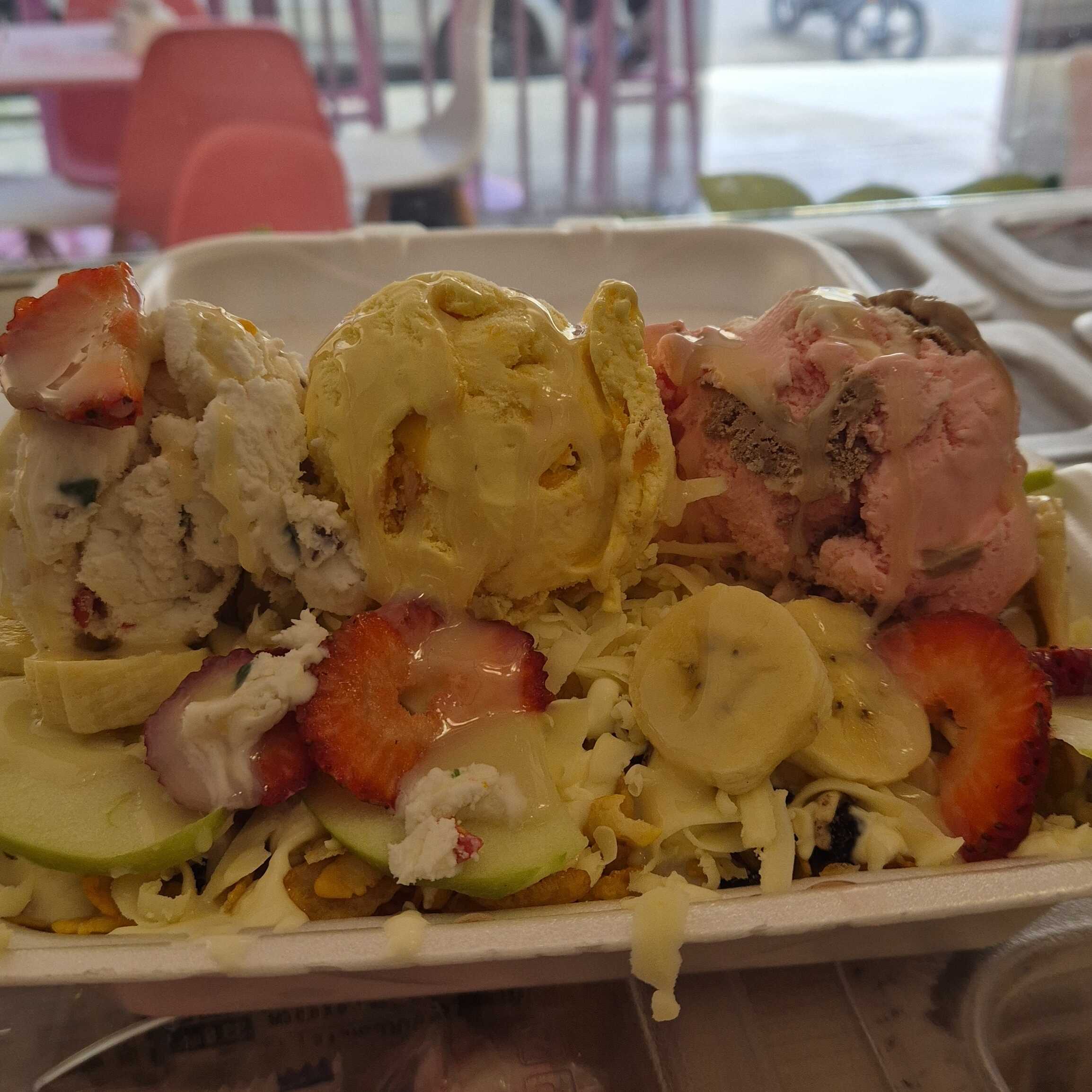3 bolas de helado,Papaya,Patilla,Banano,Kiwi,Crema de leche,Queso,Fresas,Manzana,Leche condensada.