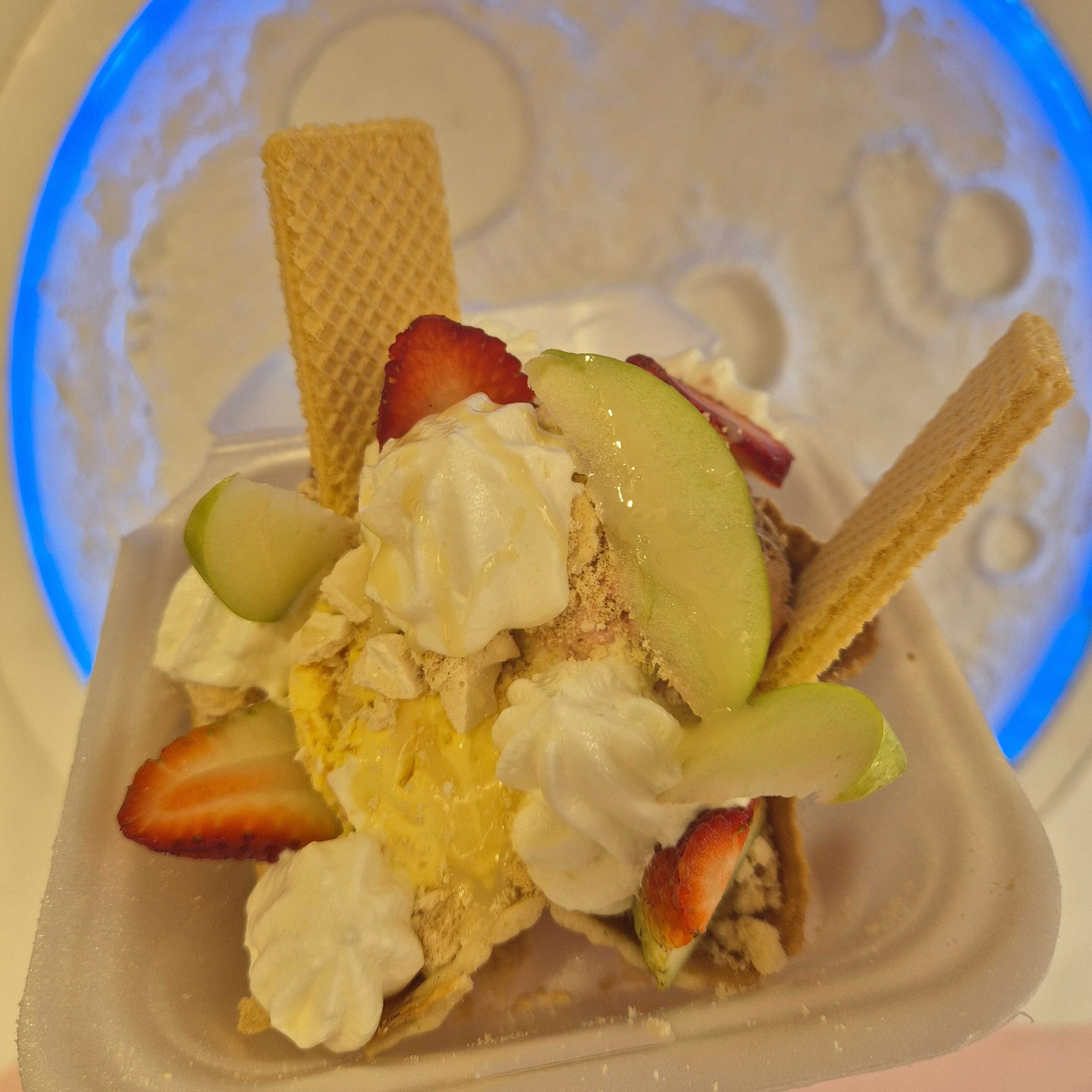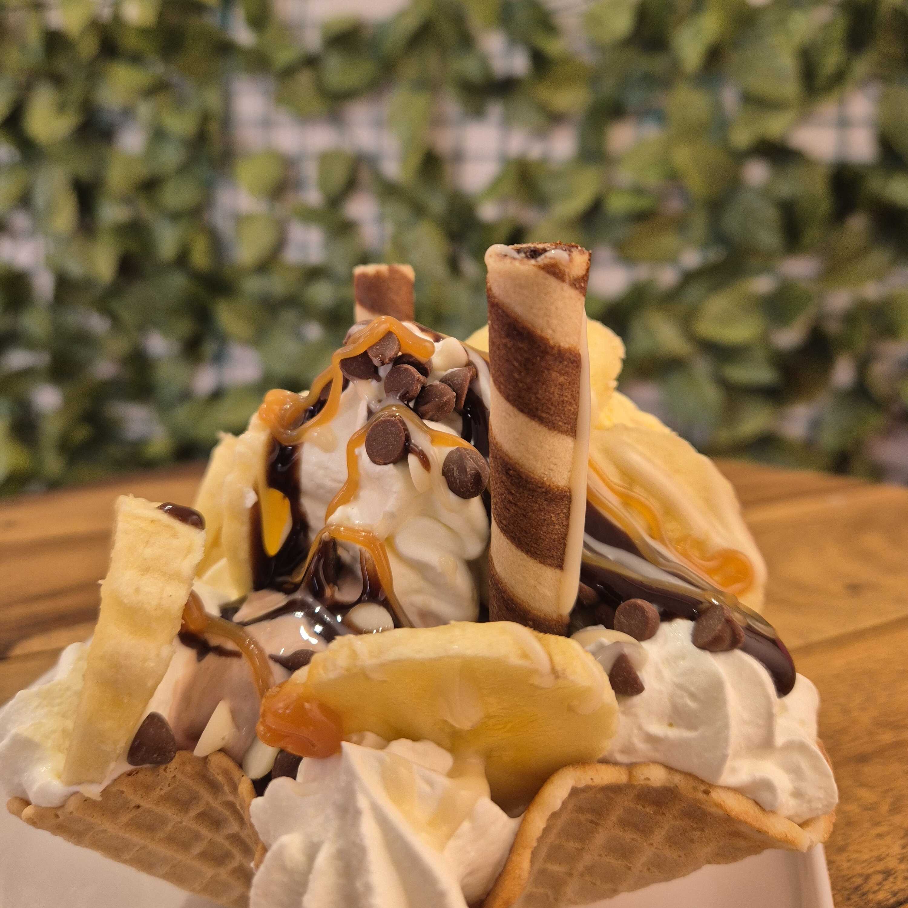 2 bolas de helado,Manzana,Barquillo,Chantilly,M&M,Leche condensada.