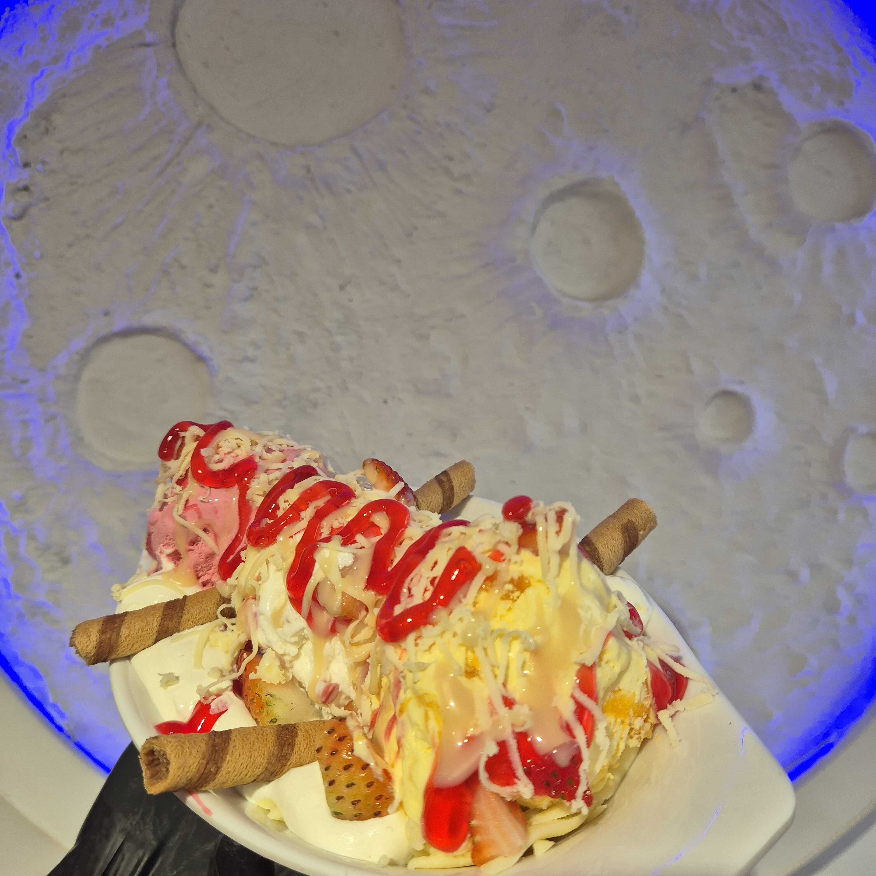 2 bolas de helado,Kiwi,Durazno,Chantilly,Salsa de mora,Cereza,Chocolate,Leche condensada.