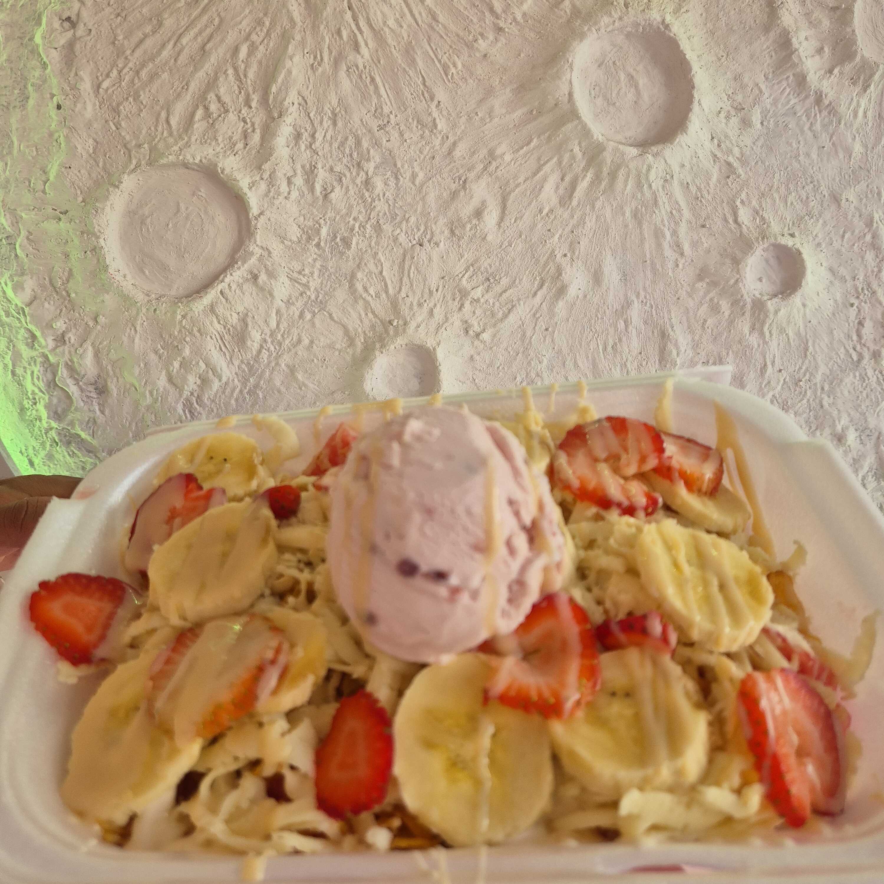 1 bola de helado,Papaya,Patilla,Banano,Kiwi,Crema de leche,Queso,Fresas,Manzana,Leche condensada.