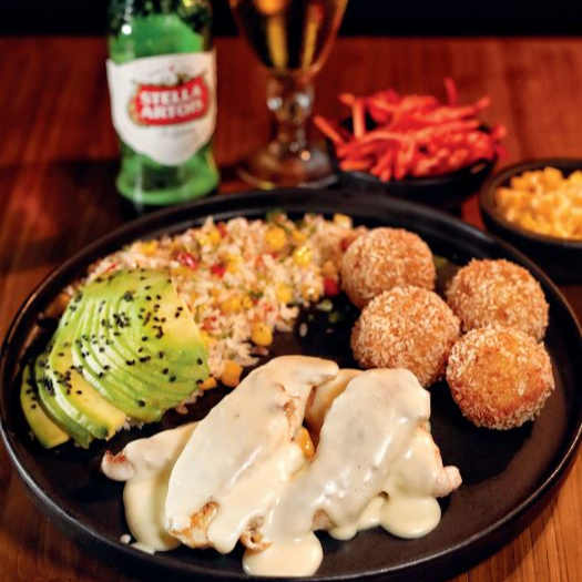 Pollo en salsa de queso, arroz acompañado de maíz dulce, croquetas de maduro y aguacate.