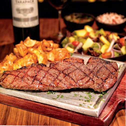 Lomo fino con tocineta, maíz, queso doble crema, pimentón, cebolla, papa criolla y arroz.