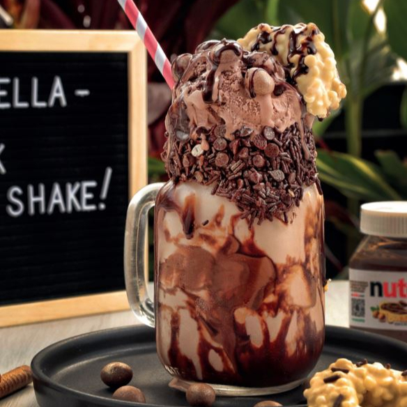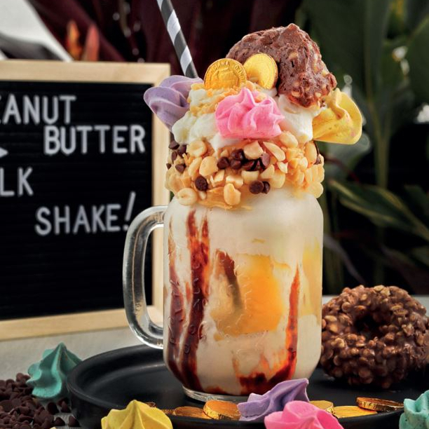 Helado de vainilla, mantequilla de maní, merengues, dulces decorativos.