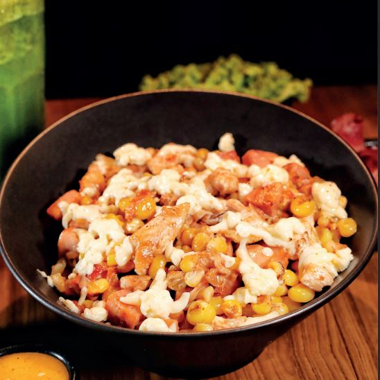 Maíz 150 g con pechuga en cubos, salchicha alemana, hogo, crema de leche y queso doble crema gratinado.