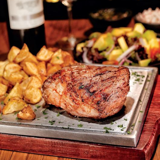 Lomo fino con champiñones, salsa de la casa, tomate cherry y papa a la francesa.