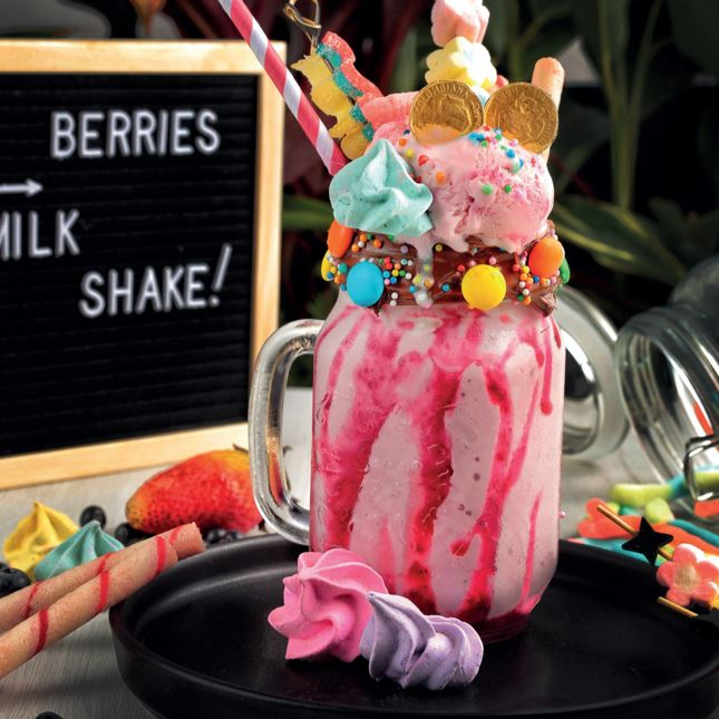 Helado de frutos rojos y vainilla, masmelos, dulces decorativos.