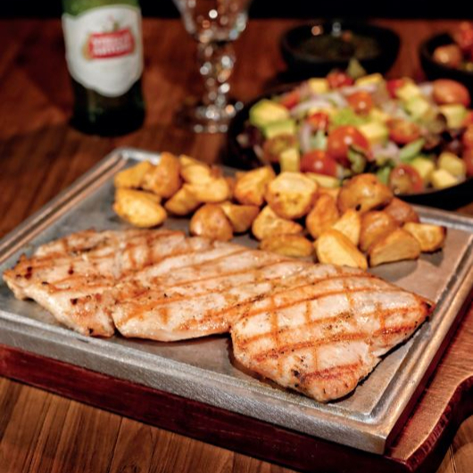 Filete de salmón a la plancha, aderezo chimichurri y 2 acompañamientos a elegir.