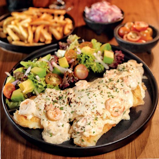 Lomo fino apanado, salsa napolitana, queso doble crema, queso parmesano y papa a la francesa.