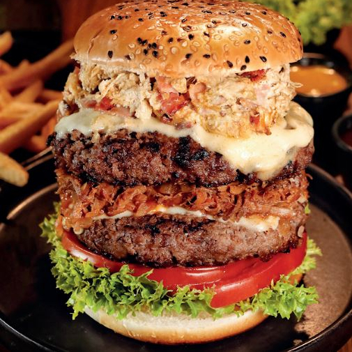 Hamburguesa con pan brioche, carne a la parrilla doble, queso doble crema 2 pzas, carne desmechada, pollo, tocineta crispí, vegetales del día, salsa.
