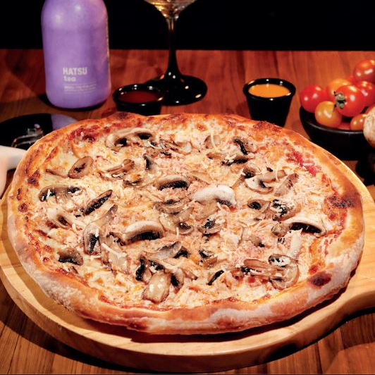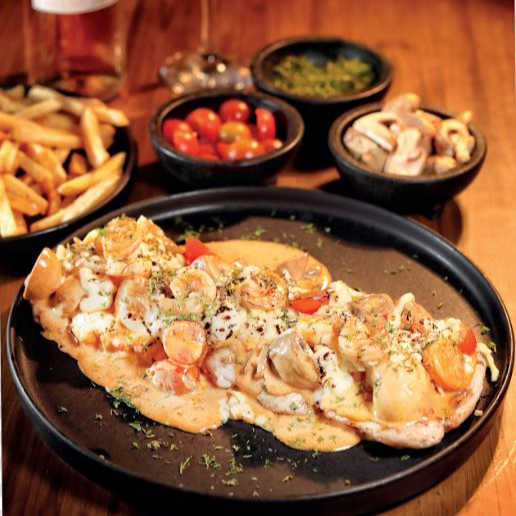 Pechuga con champiñones, camarón, queso mozzarella, queso parmesano, tomate cherry, salsa de la casa, aguacate y 1 complemento a elegir.