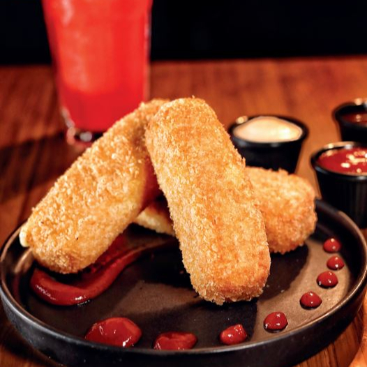 Bastones de queso apanados 3 uds acompañados de salsa de bocadillo.