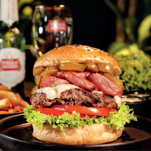 Hamburguesa con pan brioche, carne a la parrilla, doble queso doble crema, tocineta, cebolla caramelizada, vegetales de temporada, salsa.