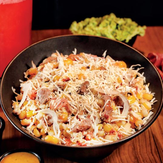 Maíz 150 g con lomo de res en cubos, pollo desmechado, tocineta, cebolla grillé, queso costeño y salsa container.