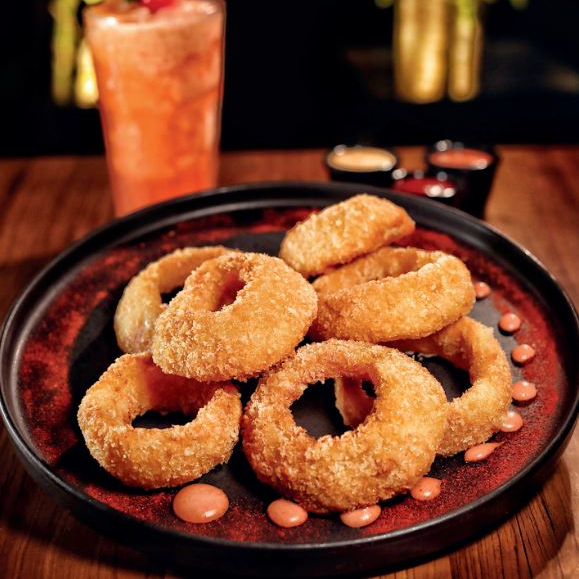 Aros de cebolla apanados 4 pzas, acompañados de salsa container.
