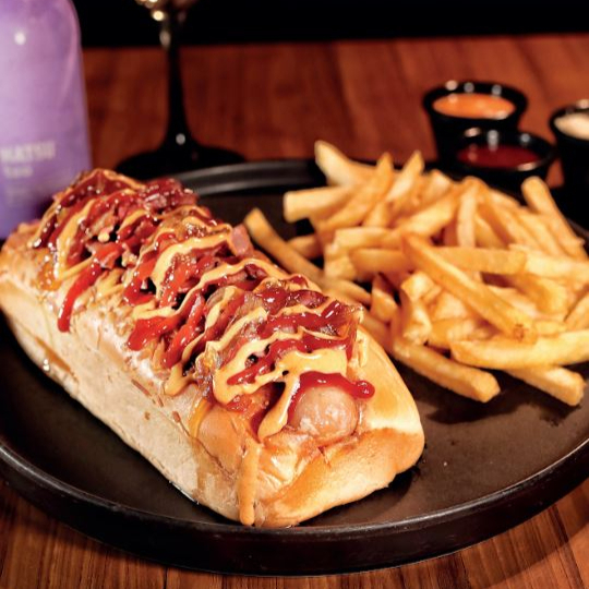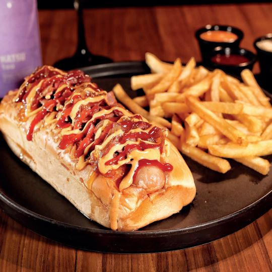 Perro caliente con pan parmesano, salchicha alemana a la parrilla, cebolla caramelizada, tocineta, salsa de tomate, salsa hot y complemento a elegir.