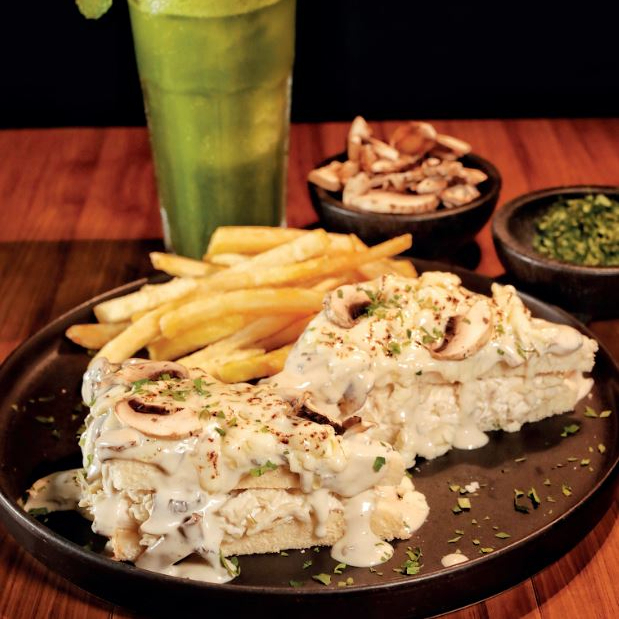 Sándwich con pan tajado, pechuga desmechada, champiñones, crema de leche, crema de leche, queso doble crema y complemento a elegir.