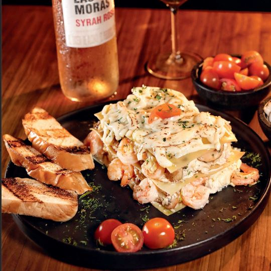 Lasagna con pollo desmechado, camarón, salsa bechamel, queso gratinado, queso parmesano y tostadas 200 g.