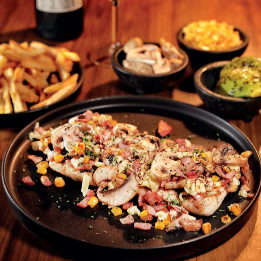 Pechuga con champiñones, tocineta, maíz, queso doble crema, queso parmesano, papa a la francesa y aguacate.