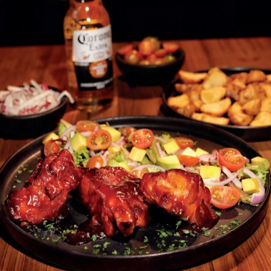 Costilla carnuda de cerdo, salsa BBQ y 2 acompañamientos a elegir.