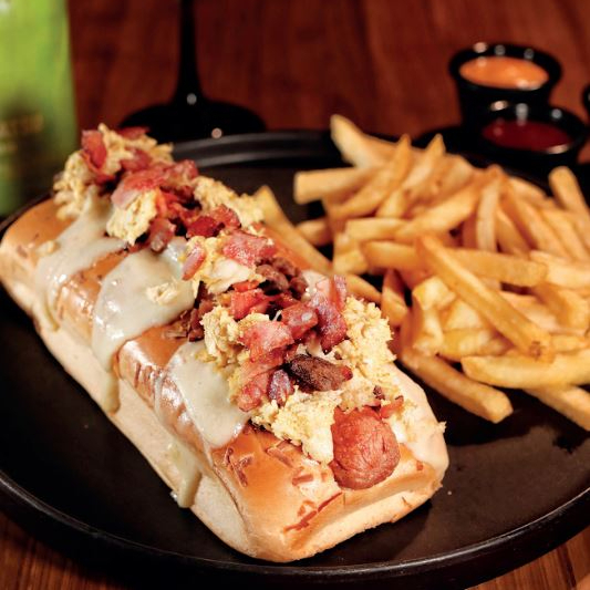 Perro caliente con pan parmesano, salchicha americana, pollo desmechado, lomo de res en cubos, tocineta, queso doble crema, salsa.