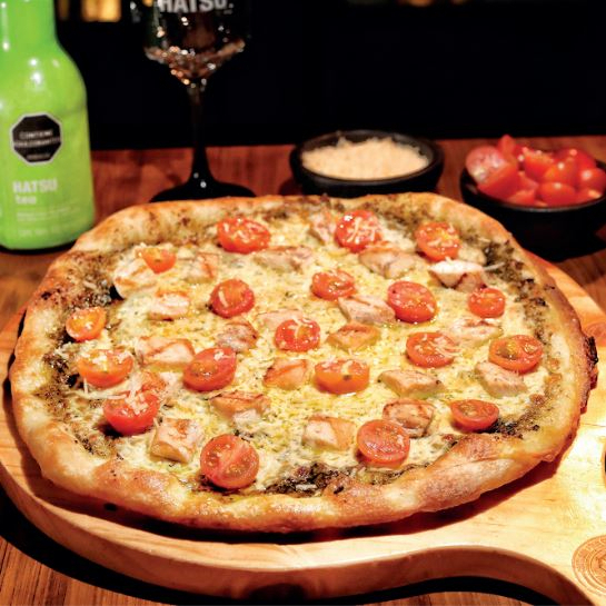 Salsa pesto, pechuga en cubos, tomate cherry, queso parmesano.