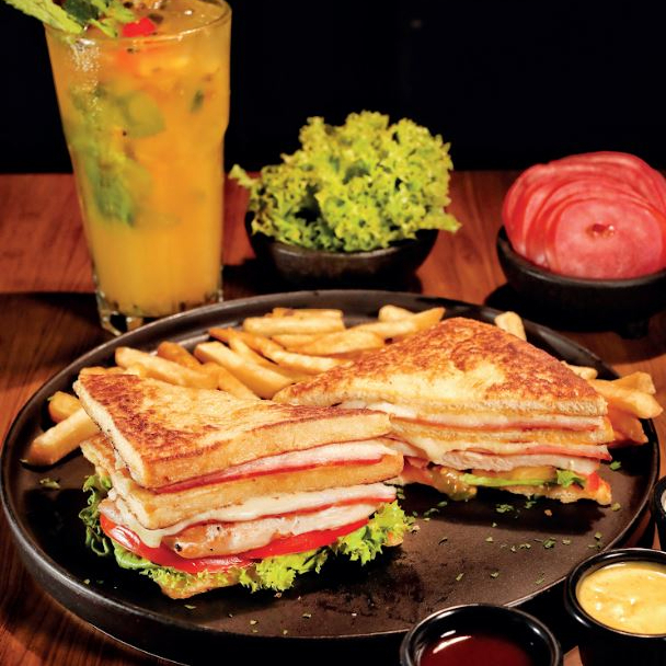 Sándwich con pan apanado, queso doble crema, jamón, pechuga, tomate, lechuga, salsa container y complemento a elegir.