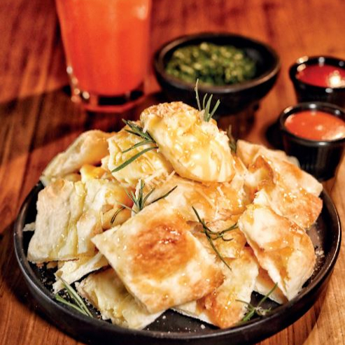 Sándwich con pan parmesano, carne desmechada, pollo desmechado, cerdo desmechado, queso doble crema, tomate, lechuga, salsa.