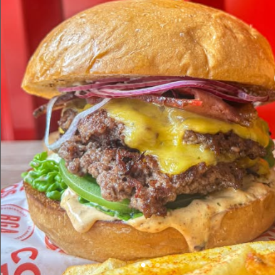 Carne de res al carbón, pan brioche, cama de chicharrón crunch, mermelada de tocineta, queso cheddar y doble aro de cebolla, lechuga, tomate y papas a la francesa