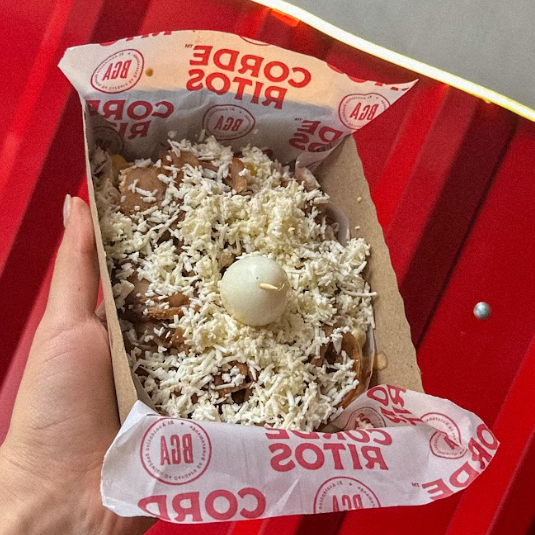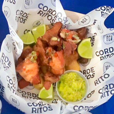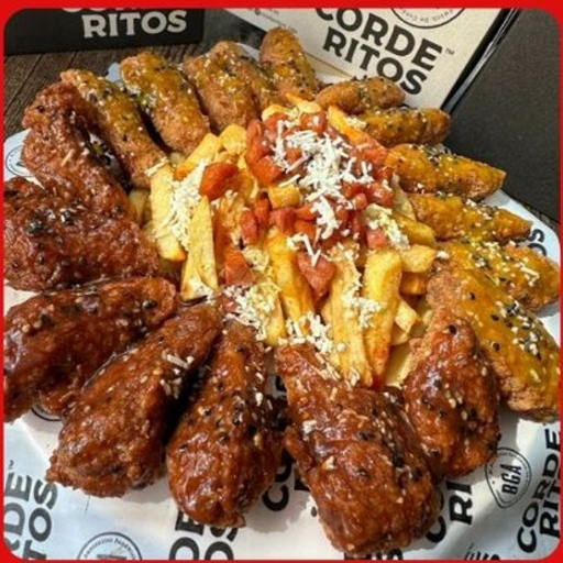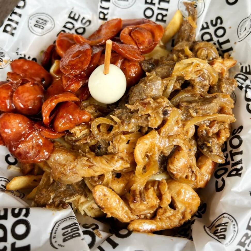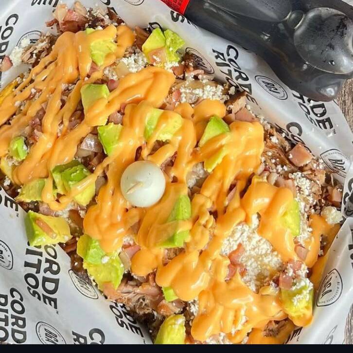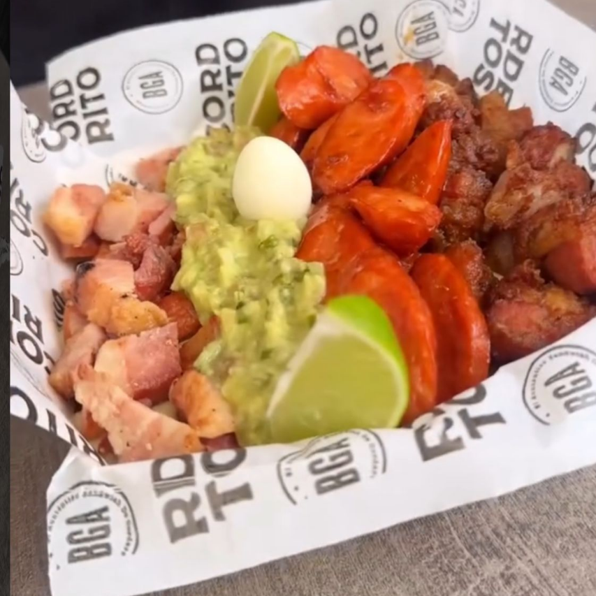 Papitas a la francesa, chorizo, panceta ahumada, pullet pork en salsa bbq tocineta, queso mozzarella fundido, papita ripio, guacamole, salsita de la casa, huevito de codorniz y limón.