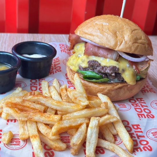 Pan brioche, doble carne smash, doble queso cheddar, tocineta, lechuga, tomate, cebolla, salsas de la casa y papas a la francesa