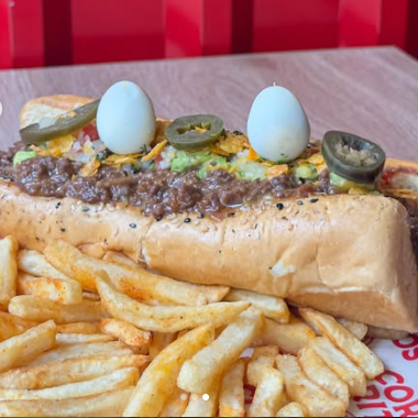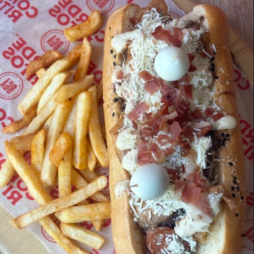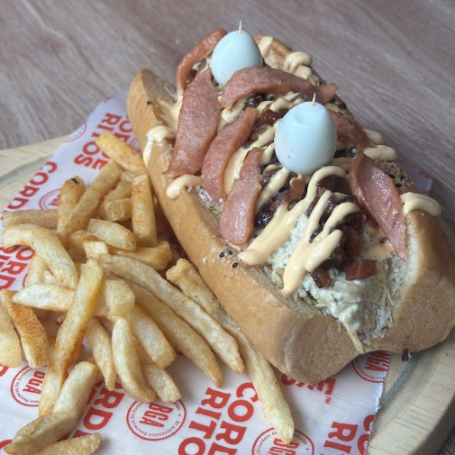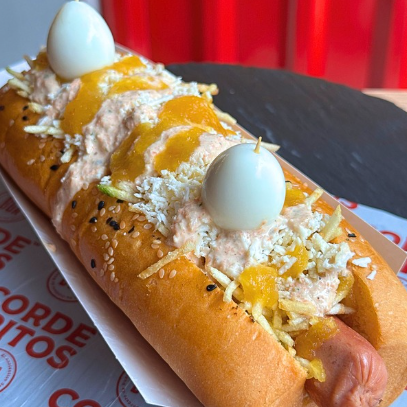 Pan brioche, salchicha americana, papita ripio, queso costeño, cebollita encurida, doble huevito de codorniz y salsa de la casa