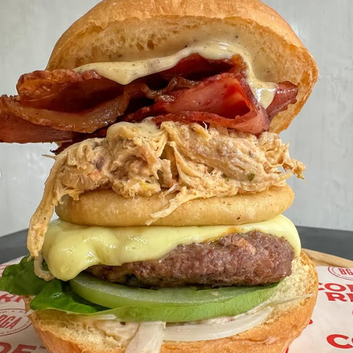 Pan brioche, carne de res de 150gr, pollito desmechado con salsa tártara, tocineta ahumada, arepa, queso mozzarella, lechuga, tomate, cebolla y salsas de la casa