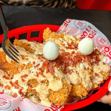 Papas francesas, tenders de pollo apanado, tocineta ahumada crispy, queso costeño, cheese balls y salsas de la casa