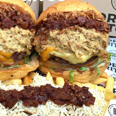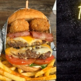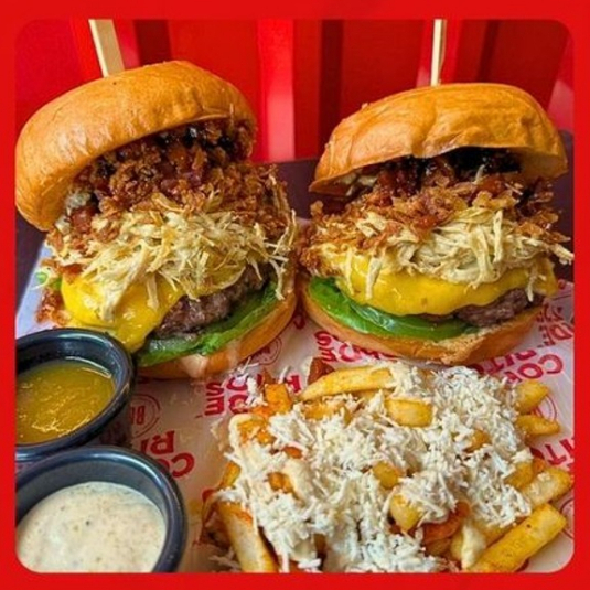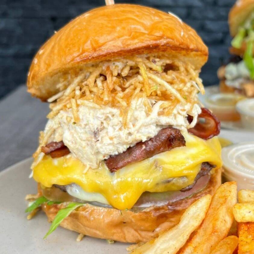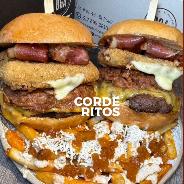 Carne de res al carbón, pan brioche, queso cheddar y mozzarella, pollo desmechado en tártara, mermelada de chorizo y tocineta bbq, cebollita crispy, lechuga romana, tomate fresco, salsas de la casa y papas a la francesa