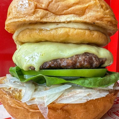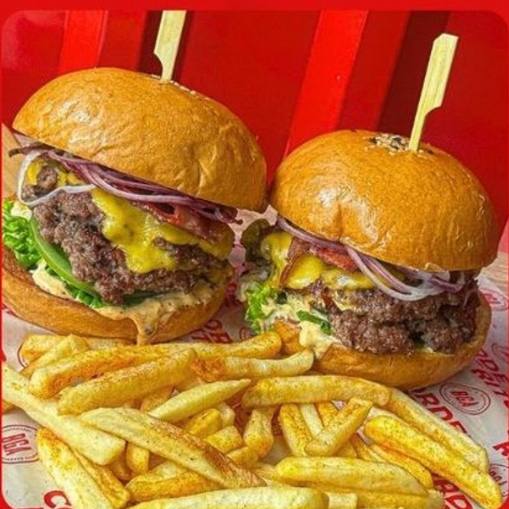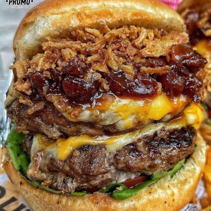Pan brioche, doble carne con cebolla en julianas smasheadas, doble queso cheddar, lechuga, tomate, cebolla, salsas de la casa y papas a la francesa