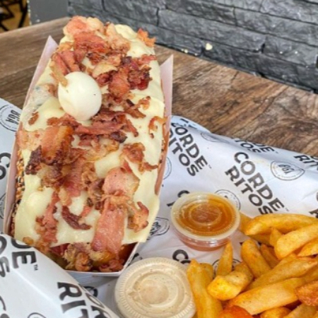 Pan brioche, pollito desmechado en salsa tártara, papa ripio, muuucha tocineta, trocitos de salchicha ranchera, queso costeño, mermelada de chorizo y tocineta y papas a la francesa.