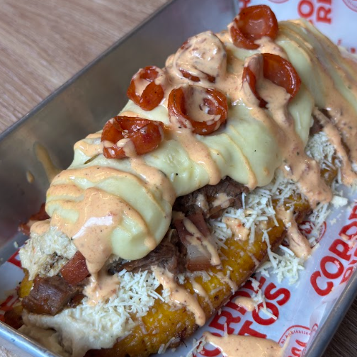 Platano maduro al carbon, pollo desmechado, maiz, tocineta ahumada, queso costeño, queso crema, queso fundido, huevo de codorniz y salsas de la casa