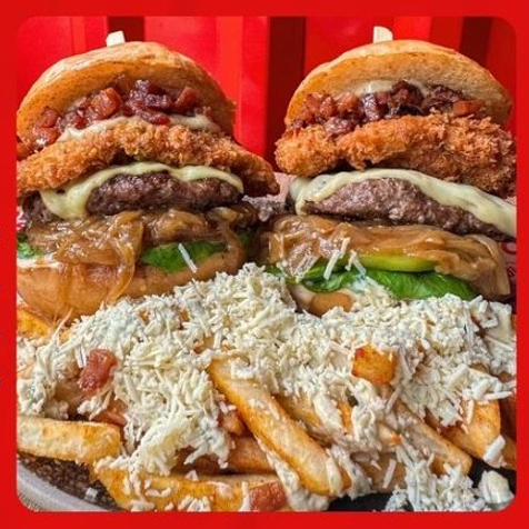Carne de res al carbon, pan brioche, queso cheddar y mozzarella, pollo desmechado en tártara, mermelada de chorizo y tocineta bbq, cebollita crispy, lechuga romana, tomate fresco, salsas de la casa y papas a la francesa
