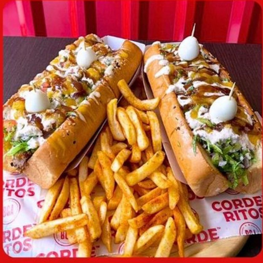 Pan brioche, salchicha ahumada, pollito desmechado en tartara, papita ripio, cuadritos de tocineta, queso mozzarella fundido, huevito de codorniz, mix de salsas de la casa y papitas a la francesa.