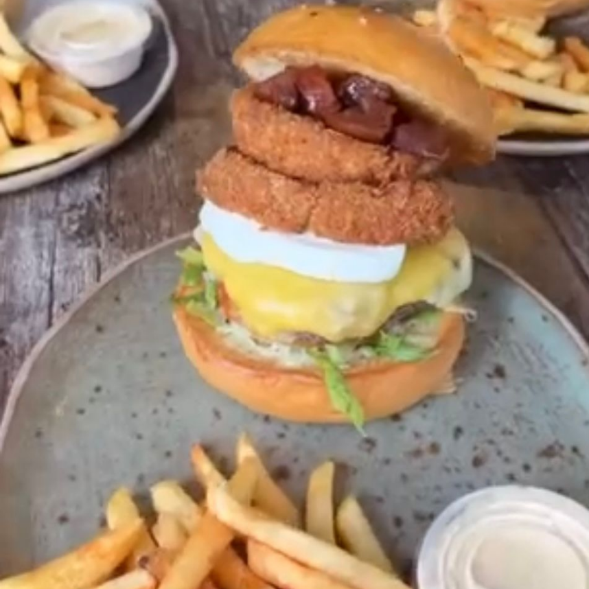 Pan brioche, tocineta ahumada, chorizo, pollo y carne al carbon papa ripio, maduro asado, queso costeño, salsas de la casa, coronada con panceta ahumad, huevito de codorniz y papas a la francesa.