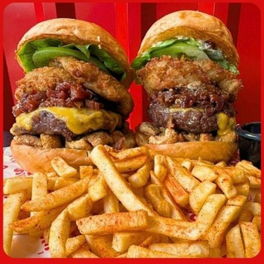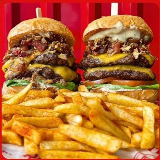 Pan brioche, doble carne smash, doble queso cheddar, doble tocineta caramelizada, cogollo, tomate, salsas de la casa y papas a la francesa