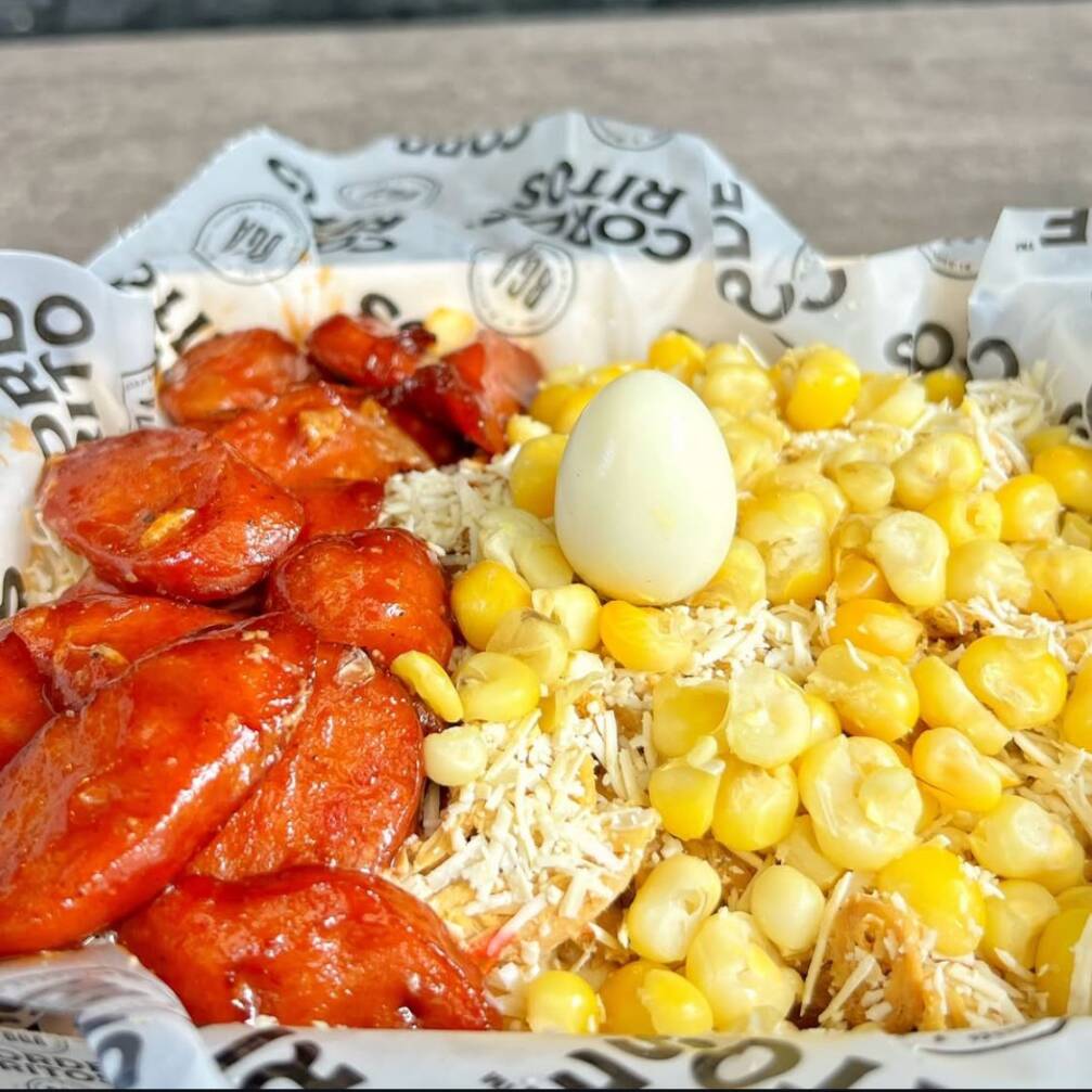 Maíz desgranado tierno, pollito en tártara, cuadritos de tocineta, queso costeño, salsas de la casa y huevito de codorniz