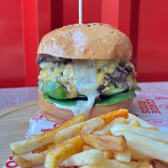 Pan brioche, doble carne smash, doble queso cheddar, lechuga, tomate, cebolla, salsas de la casa y papas a la francesa