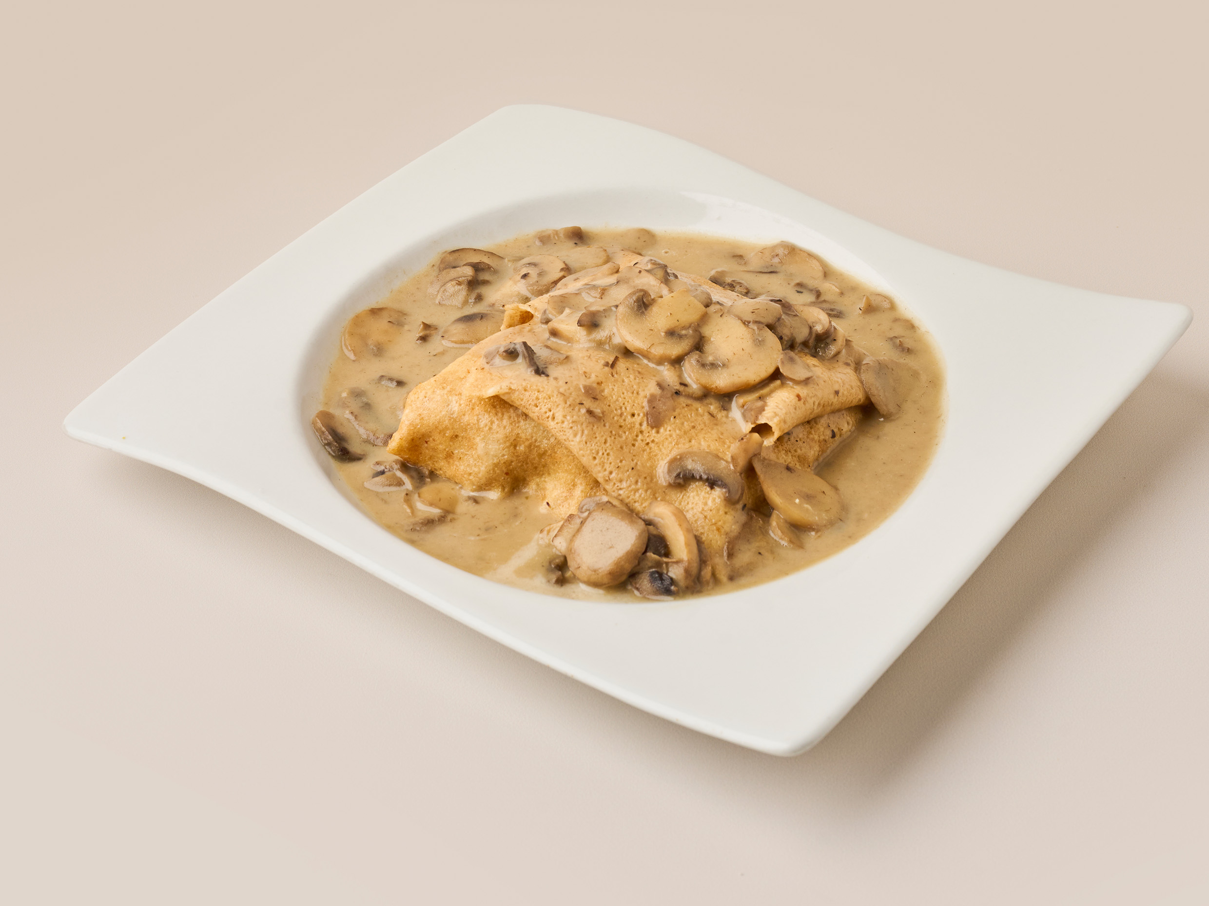 Crepe con julianas de lomo y champiñones en su salsa.