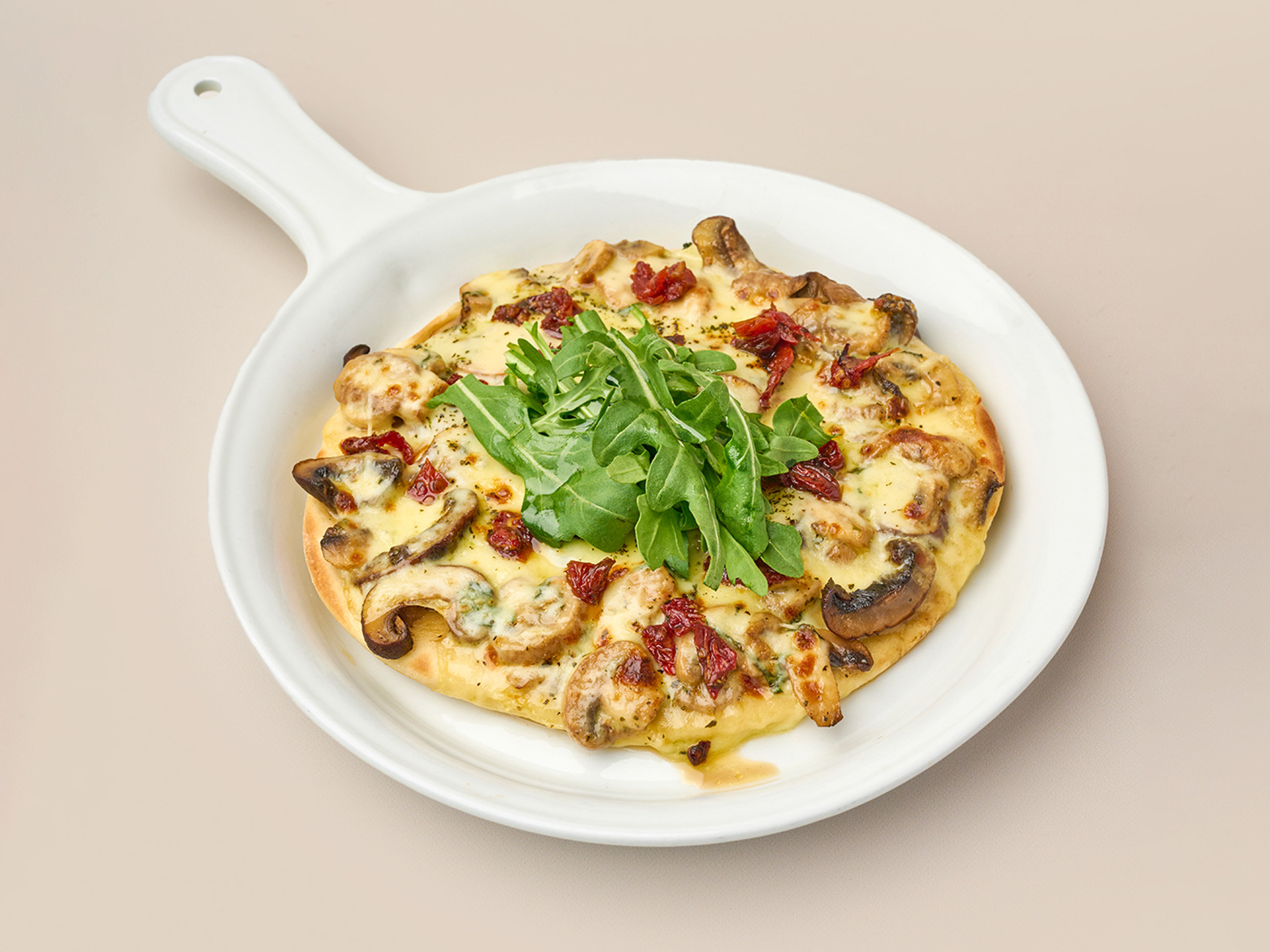 Crepe con champiñones salteados, tomates secos, tomates frescos, pesto y mozzarella de búfala.