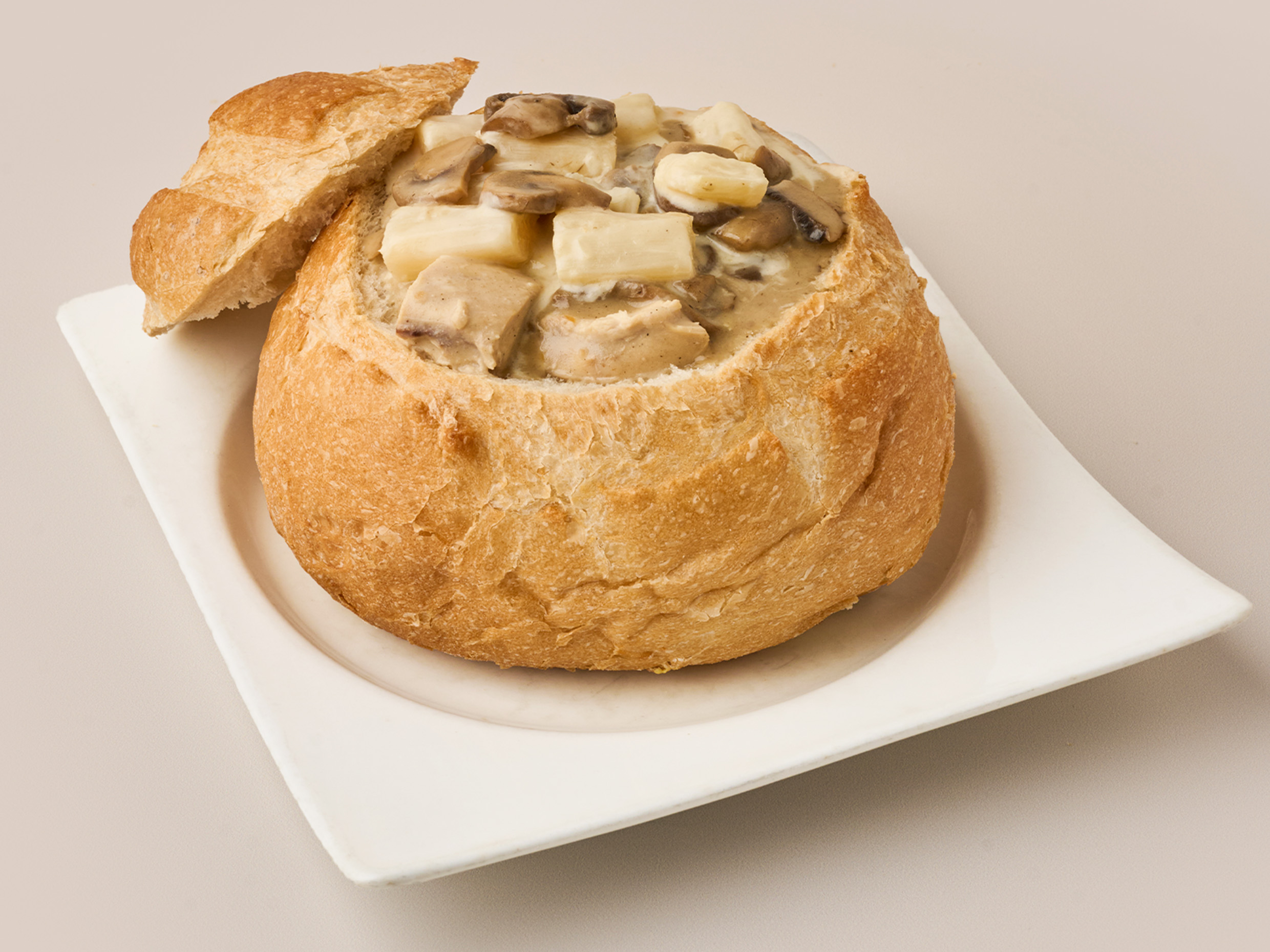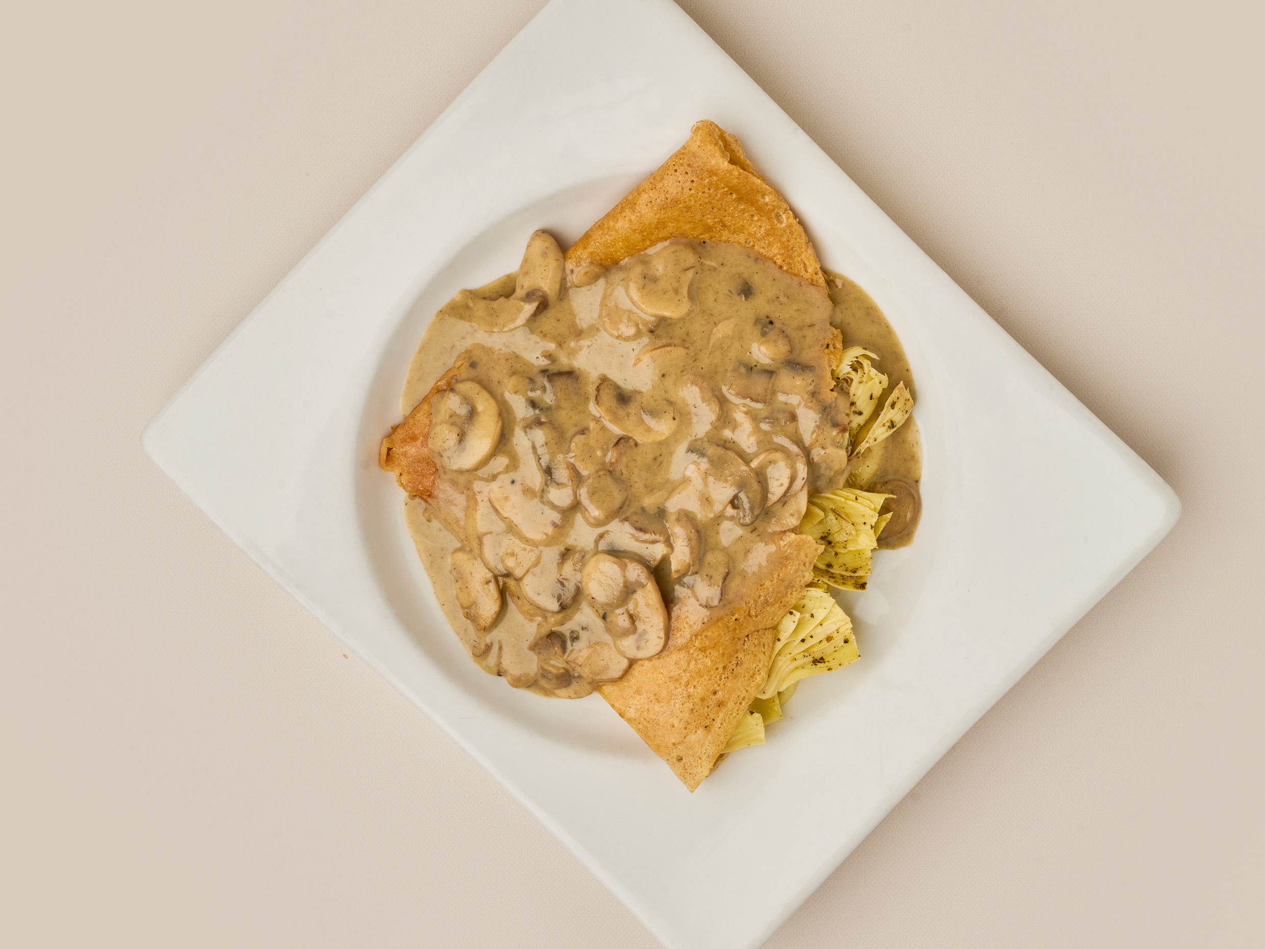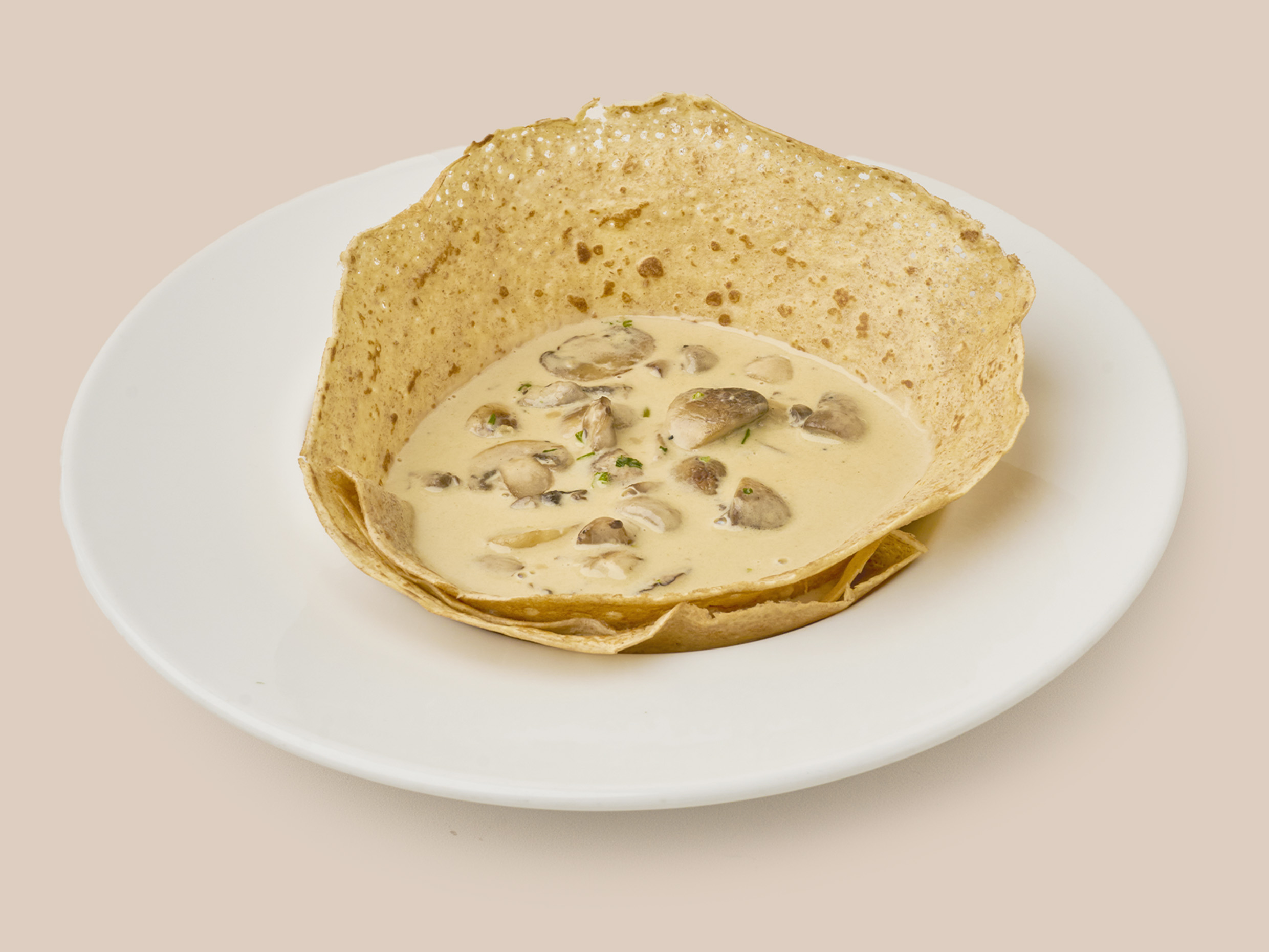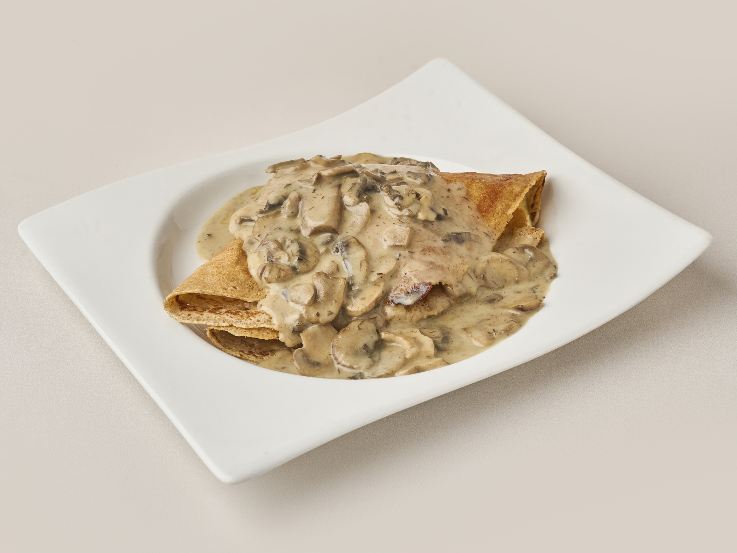 Crepe con champiñones frescos, queso holandés, mozzarella y salsa de champiñones.