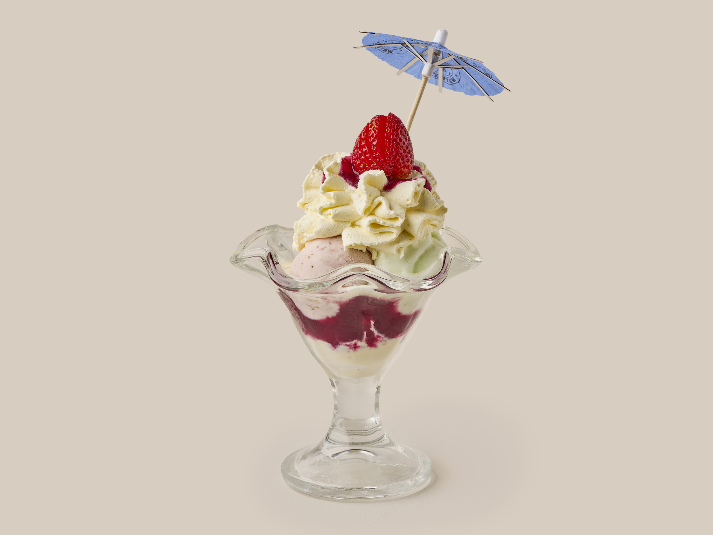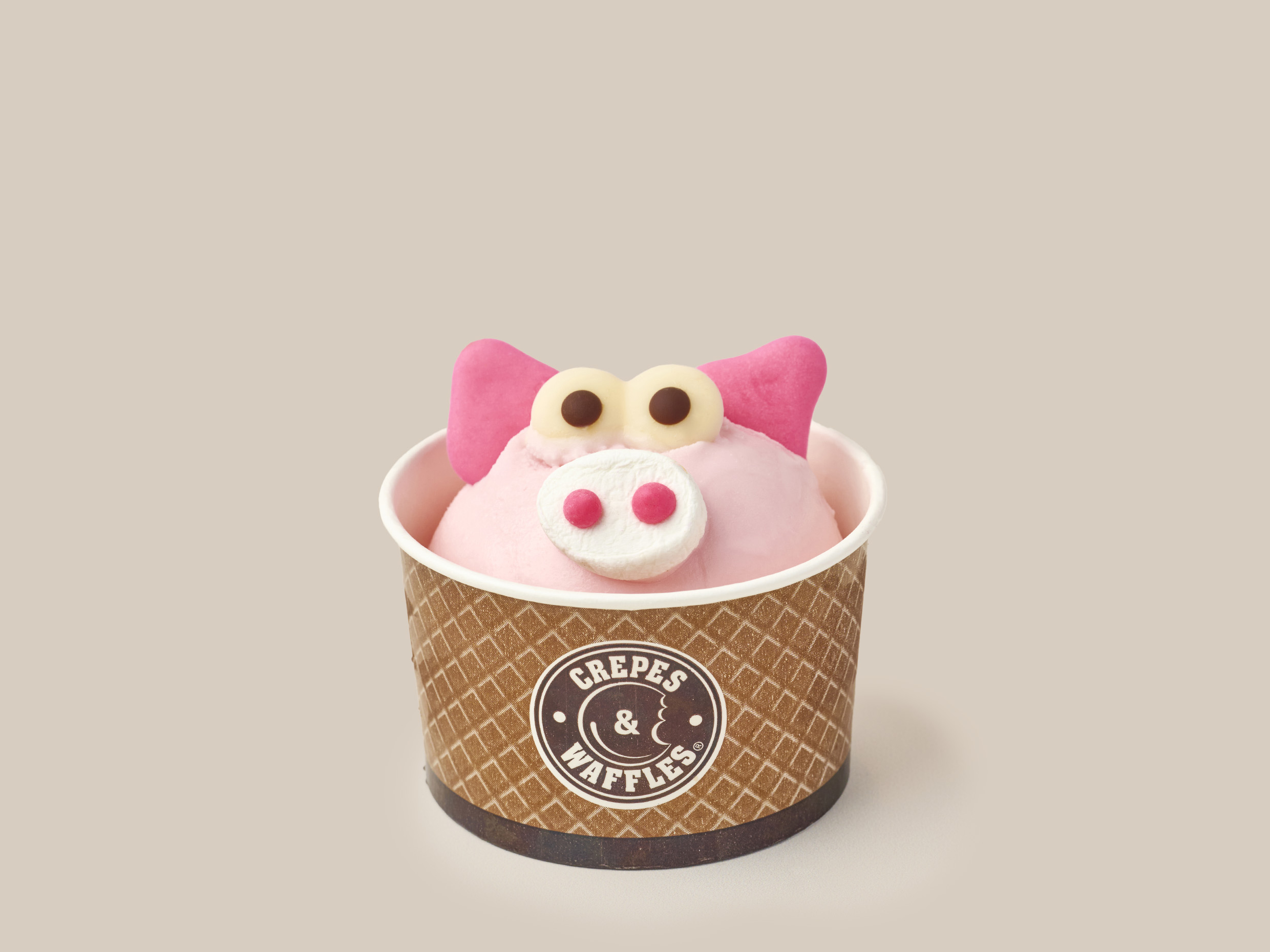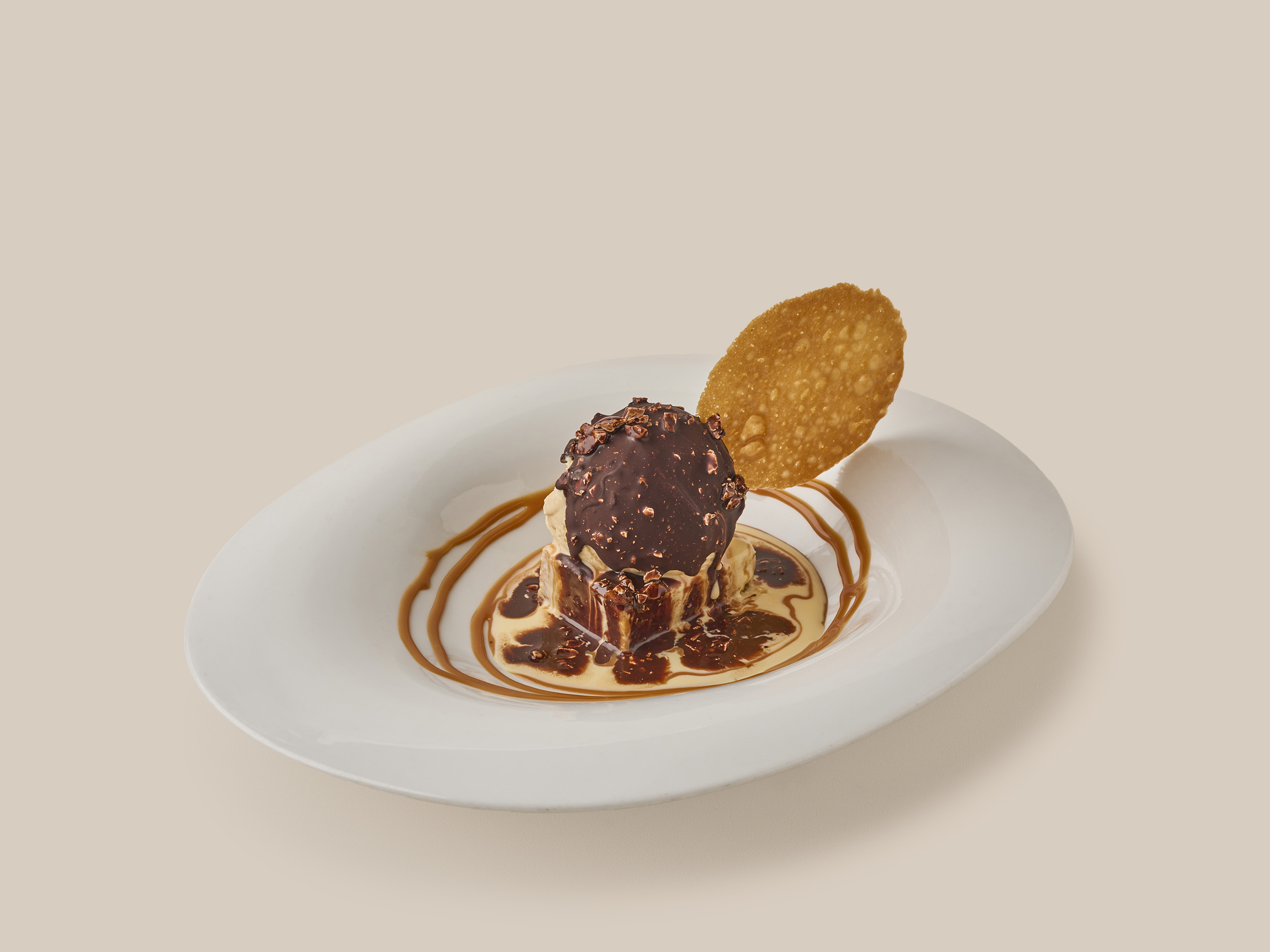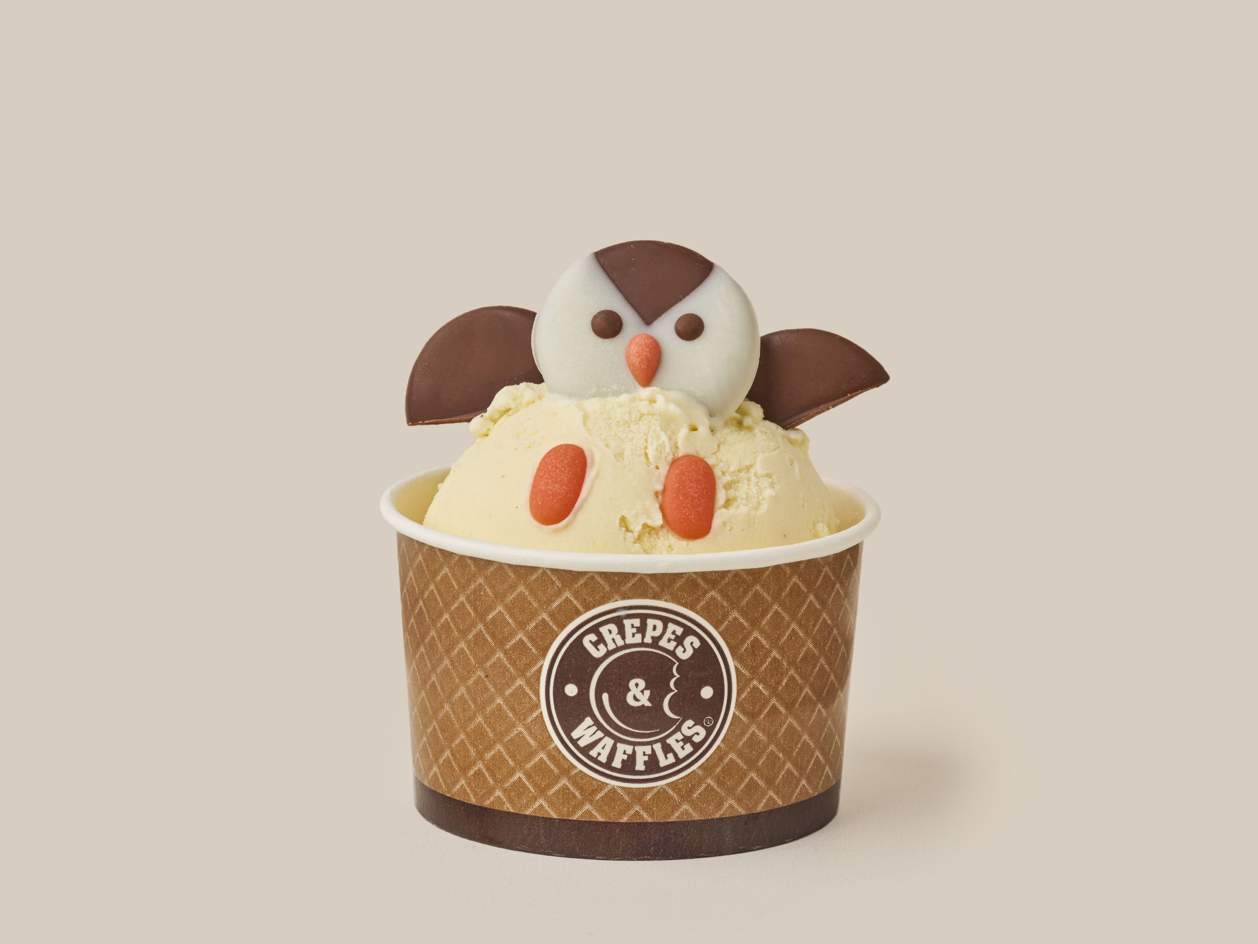 Waffle con helado y crema chantilly. Escoja hasta cuatro salsas de dulce.