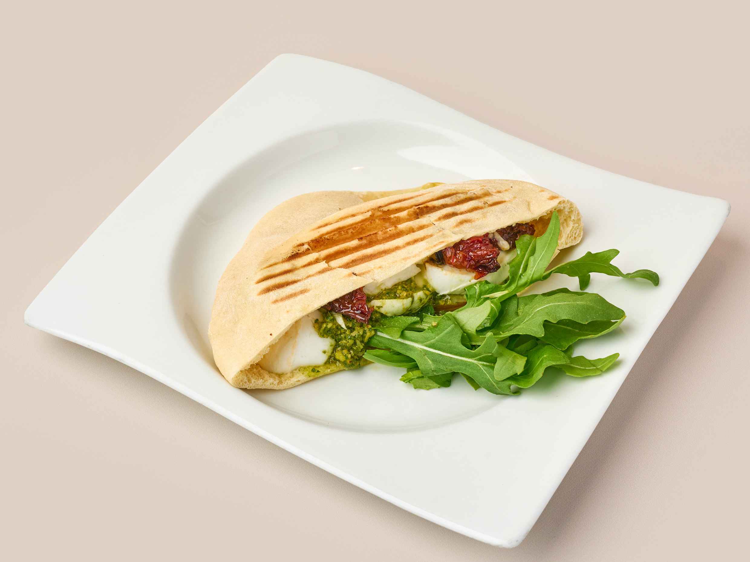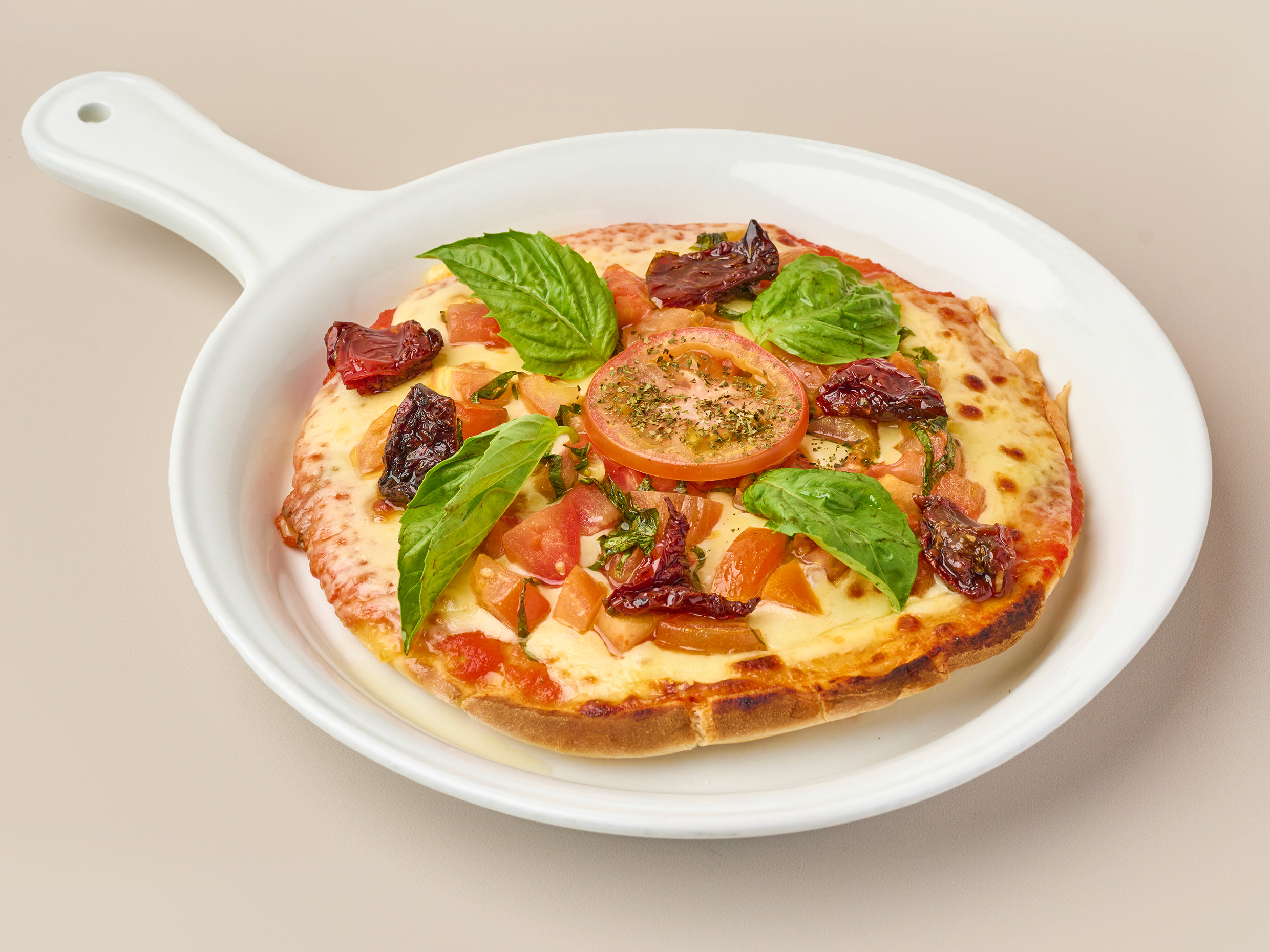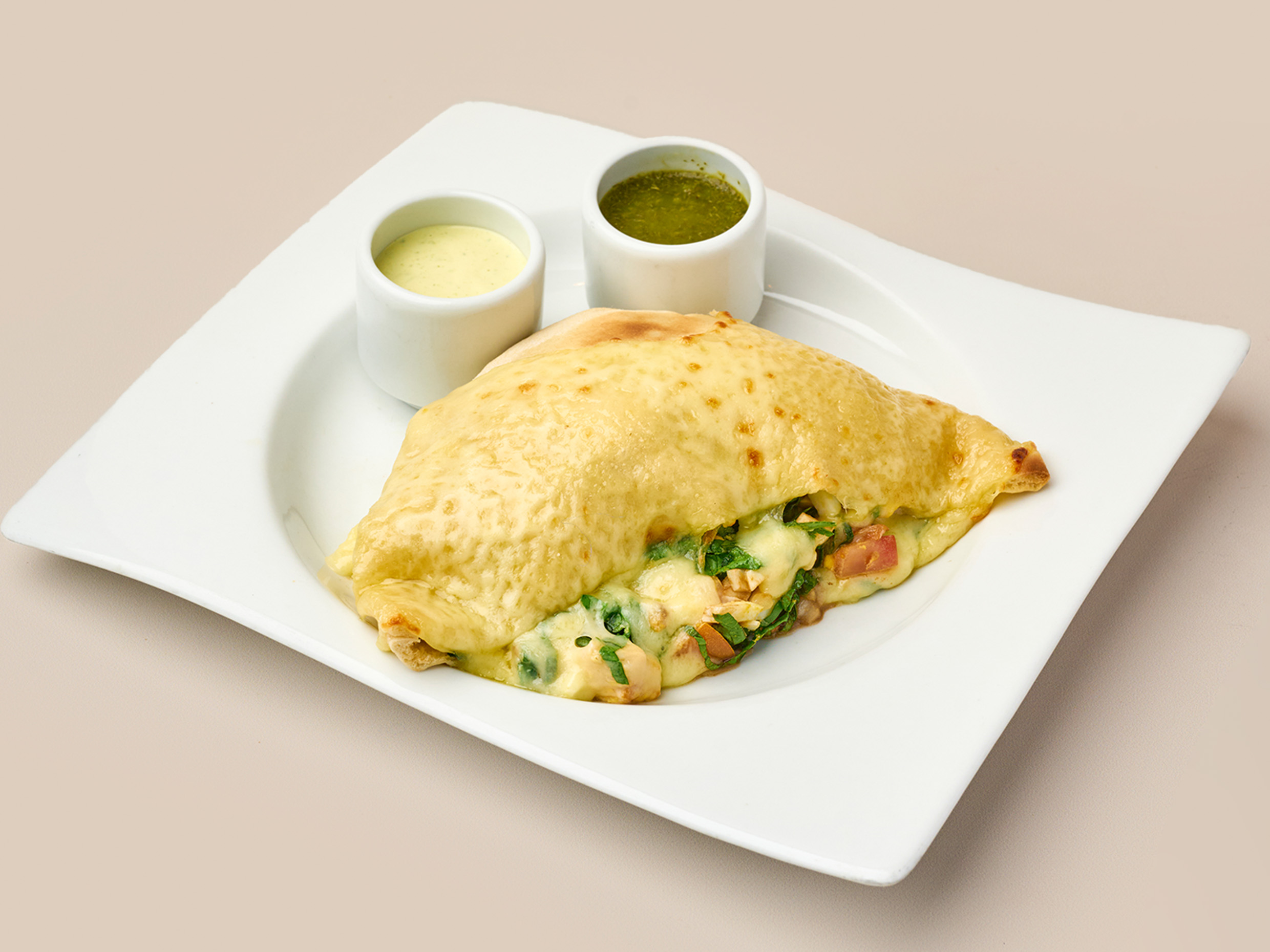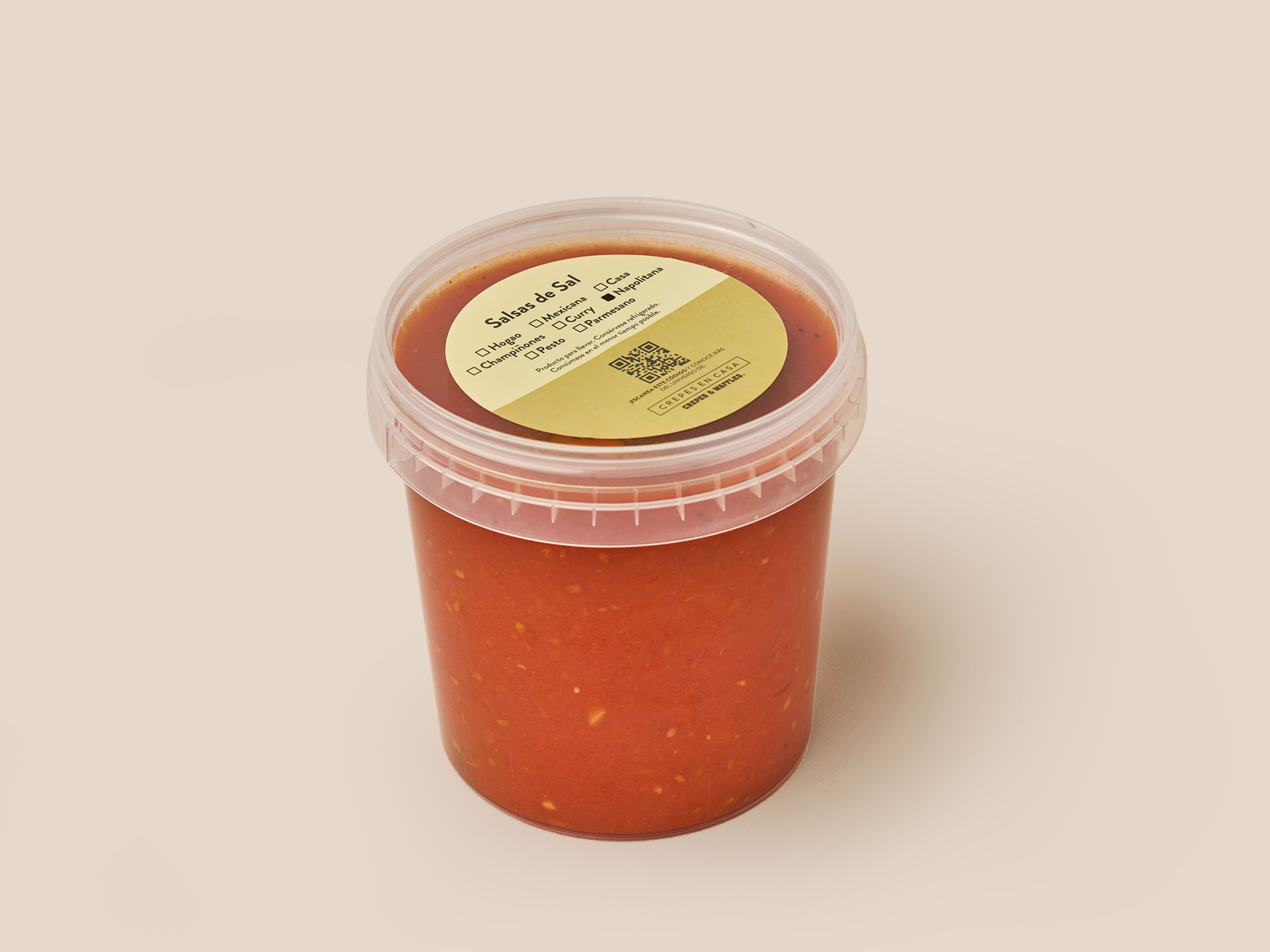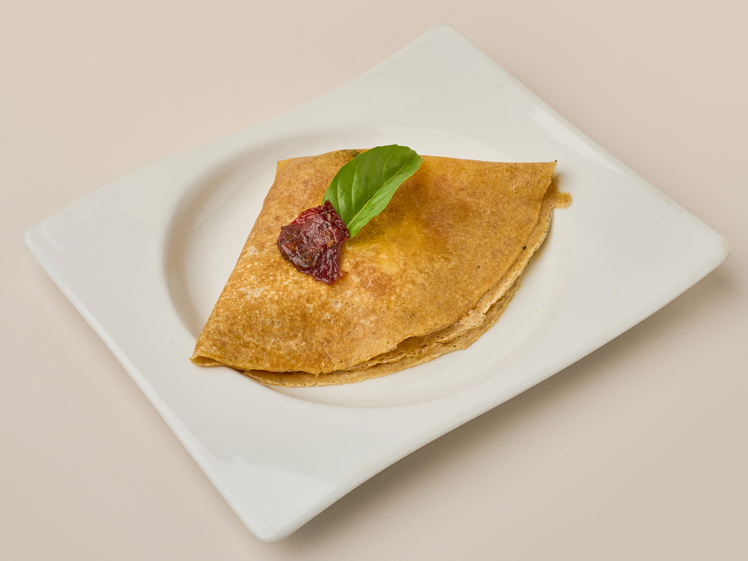 Crepe con mozzarella de búfala, salsa napolitana con albahaca y queso parmesano.