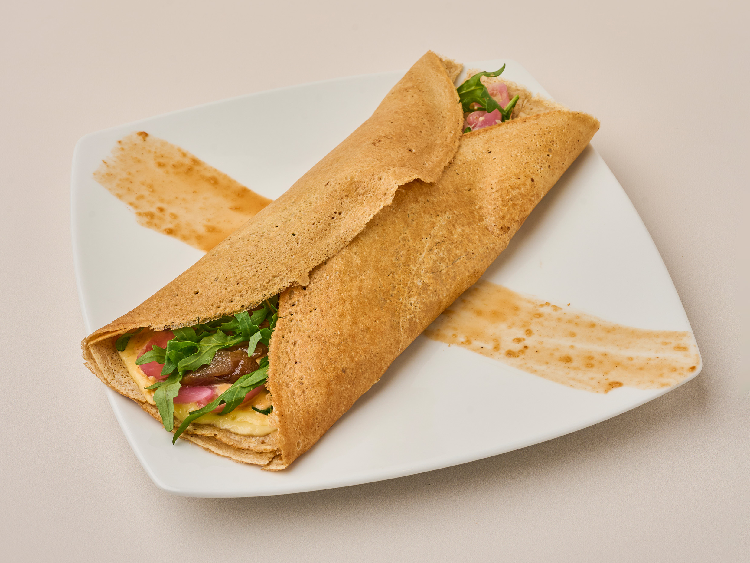 Crepe con roastbeef y queso, cebollas asadas, rúgula, mayonesa chipotle y chucrut de cebollas. (Ligeramente picante).