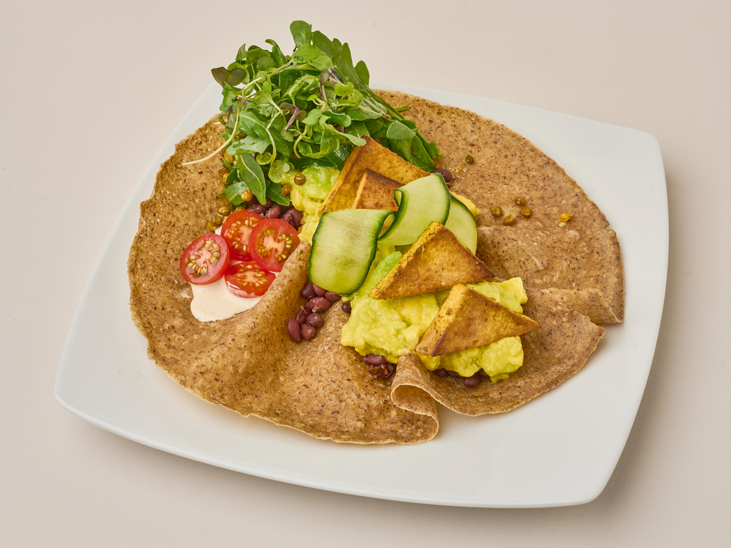 Crepe con una preparación mexicana de cerdo desmechado, acompañado de tonos cítricos y un toque de aguacate.